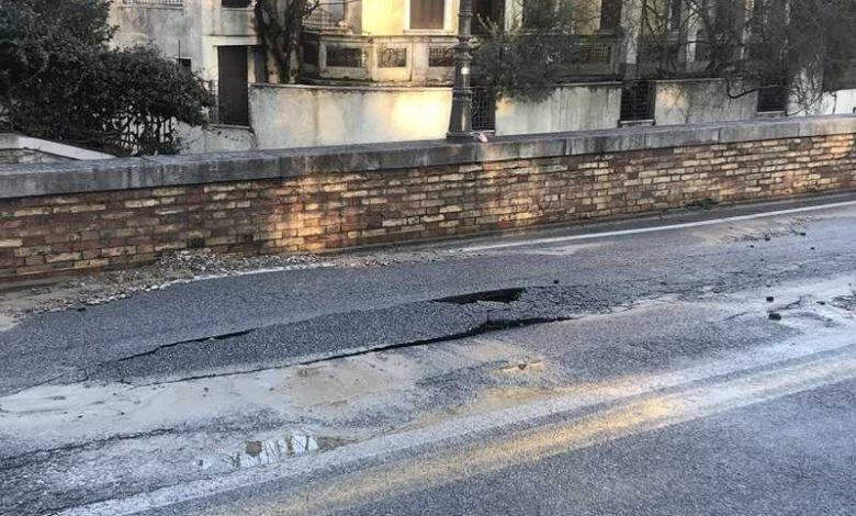 La pressione in tubatura era notevole tanto da alzare il manto d’asfalto, creando un cratere.