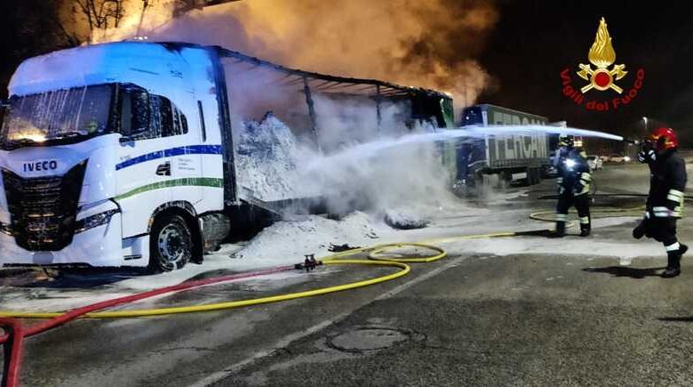 I pompieri hanno spento con la schiuma il carico di sacconi di materiale sfuso, evitando un incendio generalizzato di tutto il mezzo.
