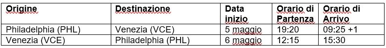 I collegamenti diretti tra Venezia e Philadelphia, reintrodotti all’inizio della stagione estiva 2022 dopo oltre due anni di sospensione, riprenderanno il 6 maggio 2023 e opereranno su base giornaliera fino alla fine del mese di ottobre 2023.
