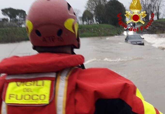 Visto l’improvviso innalzamento del livello dell’acqua i Vigili del fuoco, utilizzando l’autoscala da 42 metri, hanno raggiunto l’autovettura e dopo aver imbragato il guidatore lo hanno issato nel cestello e portato all’asciutto in zona sicura.