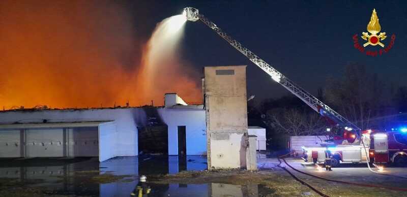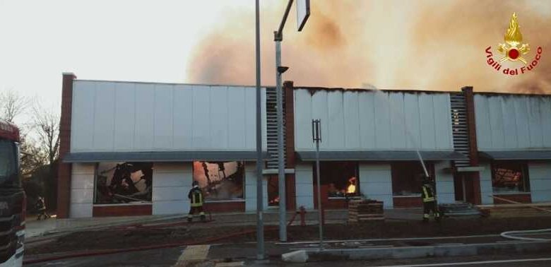 Circa l’evoluzione del rogo, Scoccimarro ha segnalato che “l’incendio perimetrale, come ho appreso, è stato domato”, mentre la struttura dell’ex mobilificio, ora padiglione espositivo, è collassata al suo interno e sta ancora bruciando.
