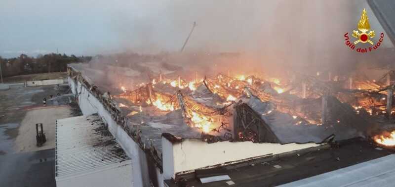L’incendio ha coinvolto l’intero capannone e sono collassati circa 10.000 metri quadrati di tetto.