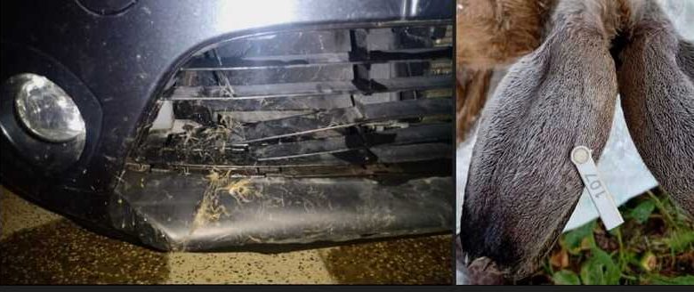 L’impatto con l’animale selvatico ha provocato danni al “muso” della macchina, fanali compresi: la povera lepre è rimasta addirittura incastrata sulla griglia del paraurti.