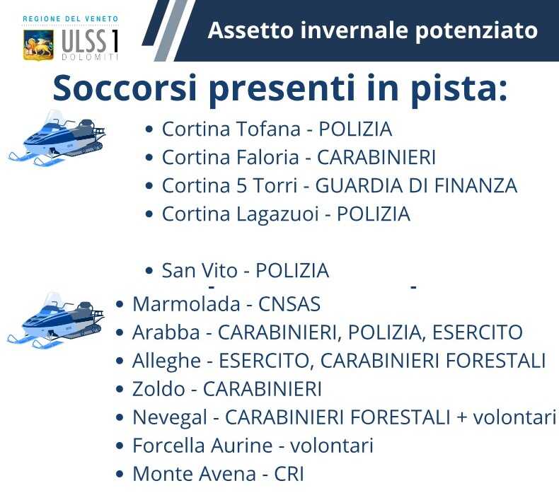 Potenziato anche lo schieramento di ambulanze dislocate nel territorio, in particolare nelle zone di Livinallongo-Arabba, Cortina, Alleghe, Auronzo e Falcade, per un totale di 18 mezzi in queste aree. Potenziati anche i turni dei volontari a supporto dei Pronti Soccorsi garantiti da diverse Croci del territorio e finanziati dall’Ulss.
