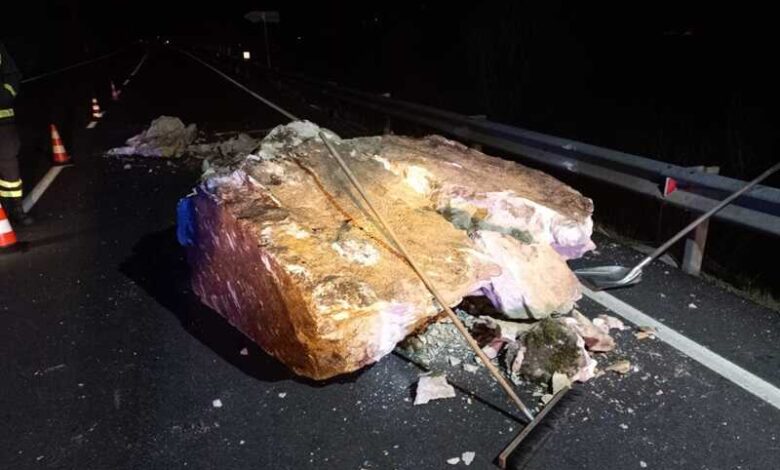 Nella foto i massi caduti nella notte sul sedime stradale.
