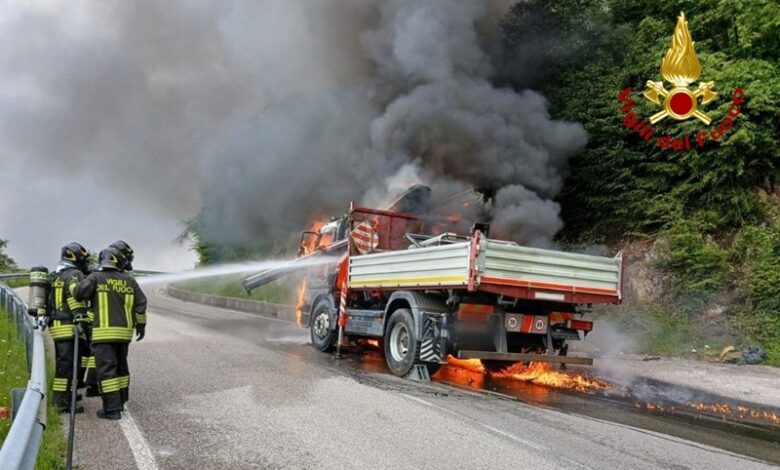 L’autista ha notato del fumo nella parte anteriore del mezzo, si è fermato a bordo strada ed è sceso con l’altro occupante dell’autocarro, dal quale avevano iniziato ad uscire delle fiamme e, mentre uno dei due chiamava i soccorsi, l’altro provava a spegnere l’incendio utilizzando un estintore senza riuscire nell’intento.