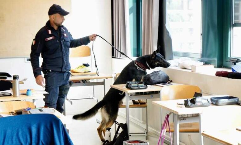 Durante i controlli, gli studenti sono stati invitati a lasciare le aule per consentire le verifiche nei locali scolastici e sugli zaini, effettuate con l’ausilio dei cani antidroga.
