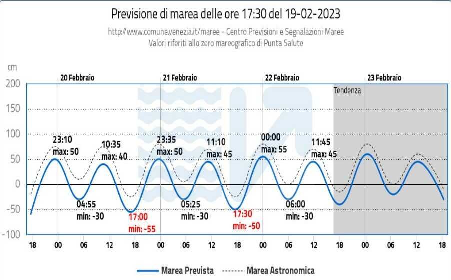 Anche domani, lunedì 20 febbraio, alle 17:00 è prevista una bassa marea a -55 e circa 24h dopo, -50.
