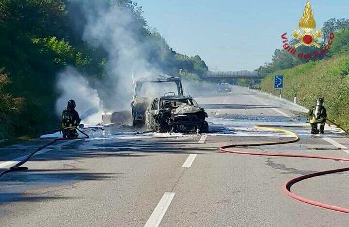 A seguito dell’impatto, parte del carico si è disperso e si è incendiato con un rogo che ha avvolto furgone e autovettura.