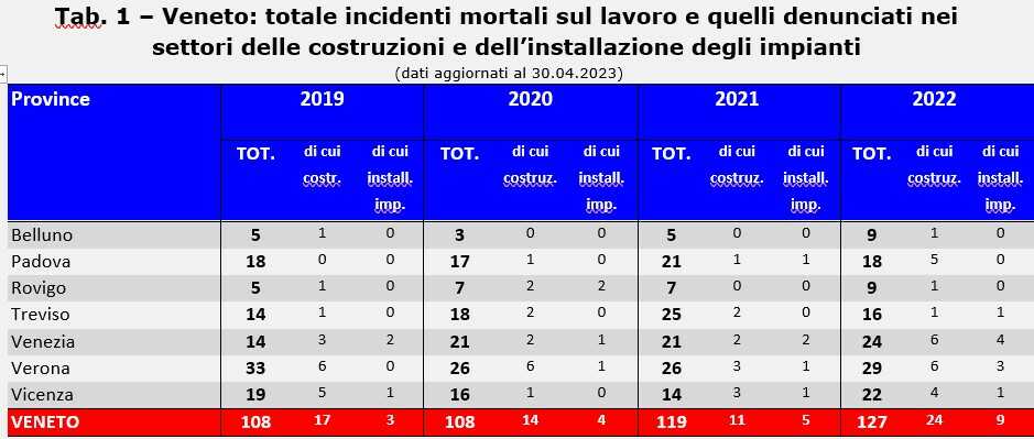 emerge, in particolare nelle province di Venezia e Verona, che tra i lavoratori deceduti nei cantieri il numero di quelli occupati in aziende appartenenti all’installazione impianti è in costante aumento (vedi Tab. 1).