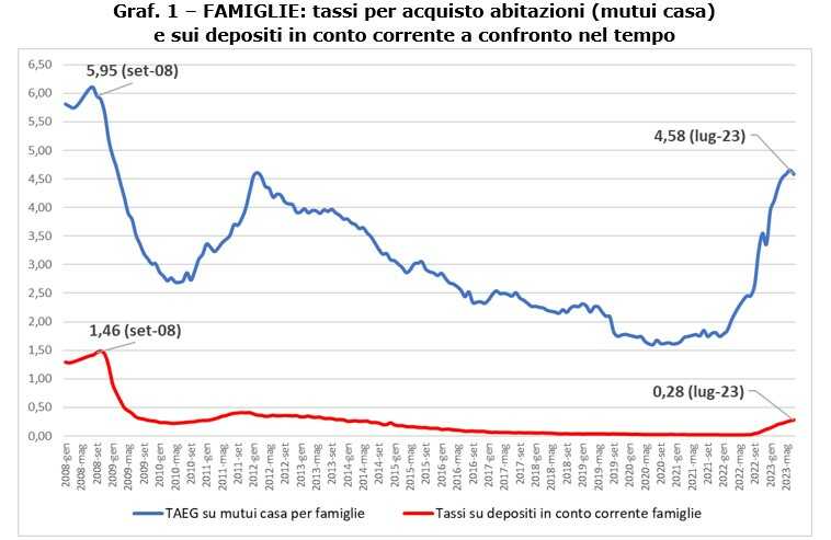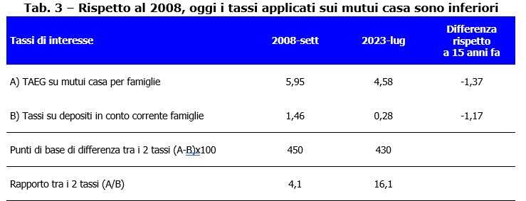 Se dal confronto tra il 2008 e il 2023 emerge che i tassi attivi sui depositi in conto corrente erano più alti 15 anni fa, è altrettanto corretto segnalare che anche dal confronto sugli interessi applicati ai mutui per l’acquisto di una abitazione, questi ultimi nel 2008 erano più alti di oggi. Sebbene il tasso di riferimento della BCE sia lo stesso (4,25%), il tasso di interesse medio inclusi i costi (TAEG) applicato oggi in Italia ad un mutuo è al 4,58%; 15 anni fa, invece, era al 5,95 %. Va altresì segnalato che i due casi appena richiamati hanno un numero di soggetti coinvolti molto diverso. Se tutte le famiglie italiane (pari a poco più di 26 milioni di unità) possiedono un conto corrente (in una banca o in Poste Italiane), le famiglie che hanno acceso un mutuo presso un istituto di credito per l’acquisto di una casa sono attualmente “solo” 3,5 milioni (circa il 13% circa del totale).