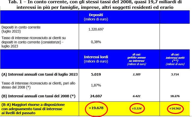 A gioire, comunque, sarebbe anche il fisco che, grazie a questo allineamento ai tassi attivi di 15 anni fa, incasserebbe 5,1 miliardi di euro di gettito in più dall’attuale applicazione delle imposte sugli interessi.