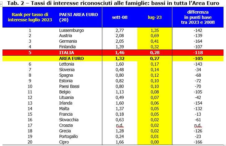 A mantenere i tassi attivi sui depositi a livelli ingiustificatamente bassi non sono stati solo gli istituti di credito italiani. Gli ultimi dati disponibili (luglio 2023) ci dicono che la media degli interessi applicati sui conti correnti delle famiglie dell’Area dell’Euro era pari allo 0,27% (-105 punti base rispetto al 2008), mentre in Italia si è attestata leggermente sopra e precisamente allo 0,28 (-118). Anche analizzando i dati relativi ai principali paesi europei, emerge un quadro generale “desolante”: in Francia la media degli interessi applicati è stata dello 0,05% (-13), nei Paesi Bassi dello 0,10 (-70), in Spagna dello 0,12 (-68) e in Germania dello 0,41% (-164 punti base rispetto al 2008).