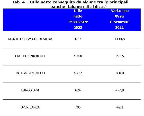 Se il ritorno dell’inflazione e il conseguente aumento dei tassi hanno comportato un generale impoverimento delle famiglie italiane, le nostre banche, invece, hanno registrato risultati di bilancio straordinariamente positivi. Nel 2022, infatti, gli istituti di credito del nostro Paese hanno totalizzato, al netto delle imposte, 21,8 miliardi di euro di utili, praticamente 8 miliardi in più rispetto al 2021 (+58 per cento) . Questa situazione è stata confermata anche nei primi sei mesi di quest’anno. Tra i primi gruppi bancari presenti in Italia, la crescita percentuale degli utili è stata molto positiva. Solo uno, BPER BANCA, nonostante un utile netto di 705 milioni di euro, ha registrato una flessione (-49,1%) (vedi Tab. 4).