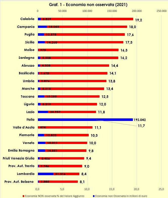 In Italia nel 2021 (ultimo dato disponibile) l’economia non osservata ammontava a 192 miliardi di euro (pari all’11,7% del valore aggiunto nazionale) (vedi Graf. 1),