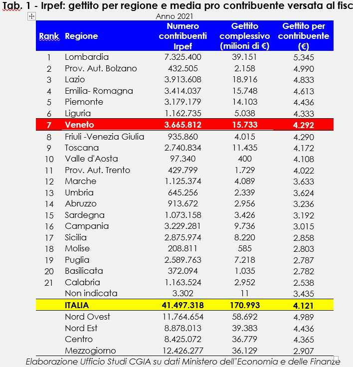 Ognuno dei 3,6 milioni di contribuenti Irpef presenti nel Veneto versa all’erario mediamente 4.292 euro all’anno .