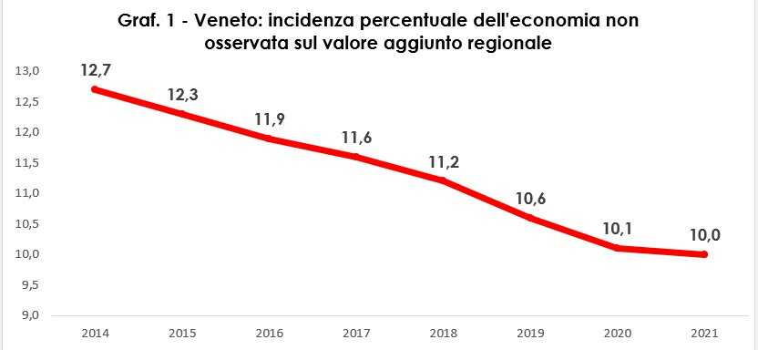 Continua a diminuire l’incidenza percentuale dell’economia non osservata – costituita dal sommerso economico, dall’economia illegale, dal sommerso statistico e dall’economia informale – in rapporto al valore aggiunto (Pil) del Veneto. Se nel 2014 era al 12,7%, nel 2021 (ultimo dato disponibile) è scesa al 10% (vedi Graf. 1).