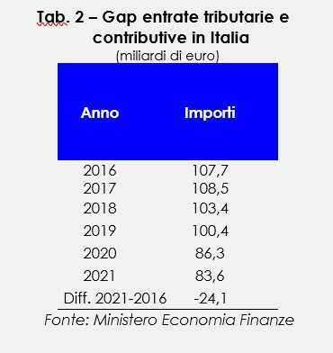 Anche la stima dell’evasione fiscale è in calo. Secondo i dati del Ministero dell’Economia e delle Finanze (MEF) , nel 2021 (ultimo dato disponibile) l’evasione tributaria e contributiva presente in Italia era pari a 83,6 miliardi di euro, di cui 73,2 miliardi riconducibili alle entrate e 10,4 miliardi ai contributi. Va segnalato che il dato complessivo è sceso di ben 24,1 miliardi rispetto al 2016 (-22,4%) (vedi Tab. 2).