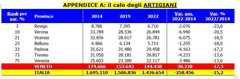Scomponendo il dato tra artigiani, commercianti e agricoltori, la contrazione più “pesante” ha interessato i primi. Tra il 2014 e il 2022, infatti, il loro numero in Veneto è diminuito di 30.228 unità (-17,3%), con punte di decremento che hanno toccato il -23,6% a Rovigo, il -20,5% a Verona e il -18,5% a Vicenza (vedi Appendice A).