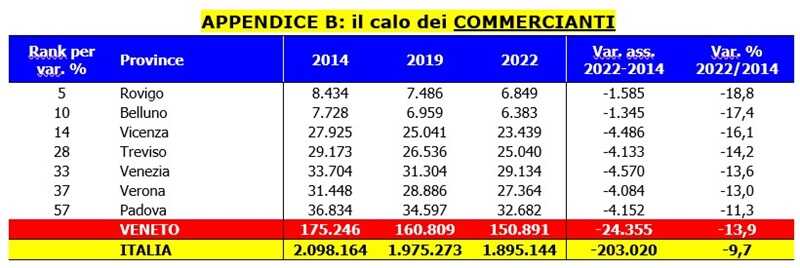 Più contenuta ma altrettanto pesante è stata la contrazione registrata dai commercianti. Sempre negli ultimi 8 anni, in regione lo stock è sceso di 24.355 unità (-13,9%). La provincia più colpita è stata ancora una volta Rovigo con una contrazione del -18,8%. Seguono Belluno con il -17,4% e Vicenza con il -16,1% (vedi Appendice B).