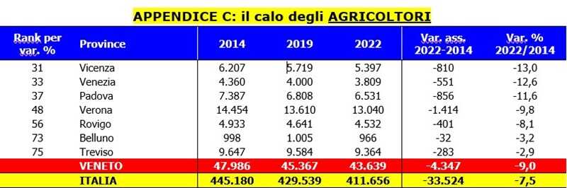 Gli agricoltori, infine, in Veneto sono diminuiti nel periodo monitorato di 4.347 unità (-9%). La provincia più penalizzata è stata Vicenza con una variazione negativa del -13%. Seguono Venezia con il -12,6%, Padova con il -11,6% e Verona con il -9,8% (vedi Appendice C).