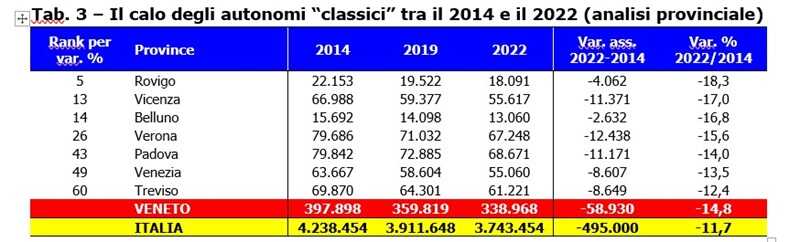 In Veneto, invece, hanno continuato a diminuire sia i primi che i secondi. Negli ultimi 8 anni, infatti, anche i lavoratori indipendenti “classici” presenti nella nostra regione sono scesi di 58.930 unità (-14,8%), con punte di riduzione che a Rovigo hanno toccato il -18,3%, a Vicenza il -17%, a Belluno il -16,8% e a Verona il -15,6% (vedi Tab. 3).