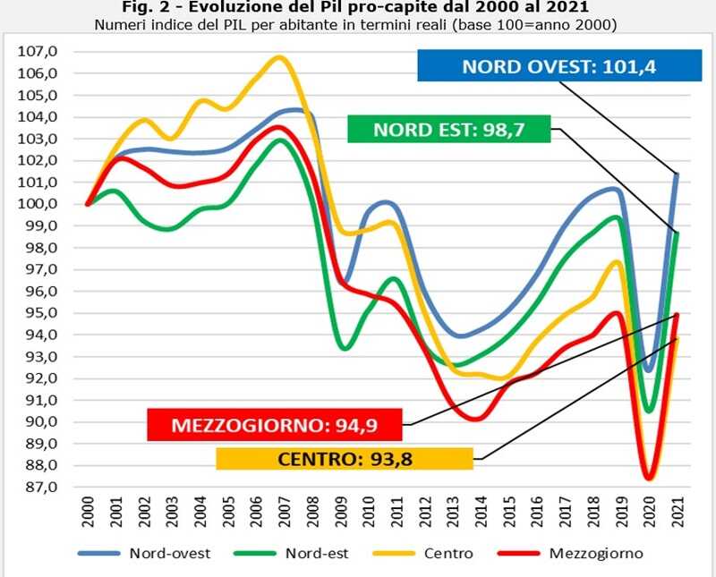 Negli ultimi decenni le disparità tra il Nord e il Sud Italia sono aumentate. Sebbene il nostro Paese abbia beneficiato tra il 2000 e il 2020 di ben 125 miliardi di euro di fondi UE per la coesione territoriale e una buona parte di questi soldi sia stata erogata proprio alle regioni del Mezzogiorno, le distanze sono cresciute. Analizzando il Pil pro-capite e fissando il dato al 2000 pari a 100, nel 2021 nel Centro l’indice è sceso a 93,8, nel Mezzogiorno si è attestato a 94,9, nel Nordest a 98,7 e nel Nordovest a 101,4. Comparando i risultati delle aree più ricche del Paese con quella più in difficoltà, registriamo che rispetto al Nordest, il Sud ha perso 3,7 punti e nei confronti del Nordovest addirittura 6,4 punti (Fig. 2).