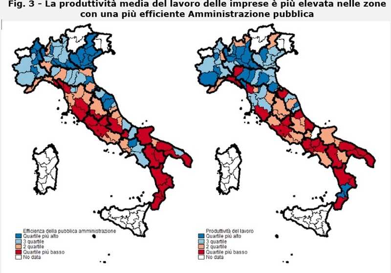 Secondo uno studio dell’OCSE , l’inefficienza della nostra Pubblica Amministrazione ha delle ricadute negative sul livello di produttività delle imprese private. In buona sostanza, dai calcoli dell’Organizzazione ottenuti attraverso l’incrocio della banca dati Orbis del Bureau van Dijk e dei dati di Open Civitas emerge che la produttività media del lavoro delle imprese è più elevata nelle zone (Nord Italia) dove l’Amministrazione pubblica è più efficiente (sempre Nord Italia). Il Veneto, da questo punto di vista, non teme confronti con nessun’altra regione settentrionale. Diversamente, dove la giustizia funziona peggio, la sanità è “malconcia” e le infrastrutture sono insufficienti (prevalentemente nel Sud Italia), anche le imprese private di quelle regioni perdono competitività (vedi Fig.3).