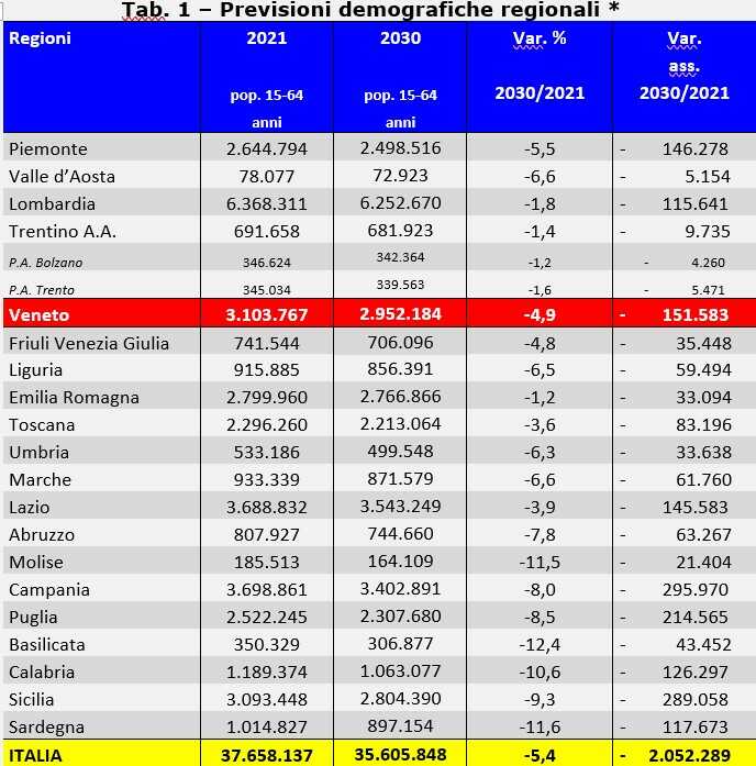Pertanto, se tre anni fa la popolazione in età lavorativa del Veneto era pari a poco più di 3,1 milioni di persone, nel 2030 la stessa è destinata a scendere a poco più di 2,95 milioni di unità. (vedi Tab. 1).