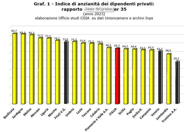 Ad oggi, la regione che presenta l’indice di anzianità dei dipendenti privati più elevato è la Basilicata (82,7). Il dato medio nazionale, come ricordavamo più sopra, è pari al 65,2. Le regioni meno “colpite” da questo fenomeno – anche se già da alcuni anni sono costrette comunque a fare i conti con questa grave criticità – sono l’Emilia Romagna (63,5), la Campania (63,3), il Veneto (62,7), la Lombardia (58,6) e, con il dato più basso d’Italia, il Trentino Alto Adige (50,2). Ad eccezione della Liguria, con un indice del 73,6, il Friuli Venezia Giulia ha il valore più elevato tra tutte le regioni del Nord (vedi Graf. 1).