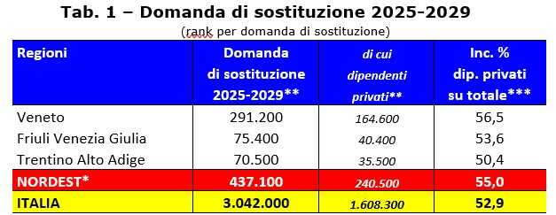 Tra il 2025 e il 2029, si stima che 437.100 lavoratori nordestini lasceranno definitivamente gli uffici e le fabbriche per andare in pensione. La quasi totalità lo farà per questo motivo; tuttavia, una piccola minoranza non timbrerà più il cartellino anche per altri motivi, quali il ritiro volontario, la perdita dell’impiego, l’emigrazione all’estero o il passaggio dal lavoro dipendente a quello autonomo e viceversa.