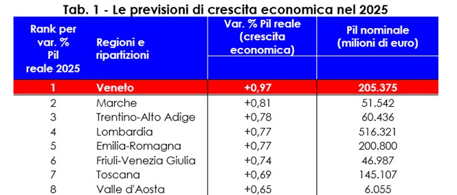 Dopo alcuni anni in cui seguivamo di una incollatura Lombardia ed Emilia Romagna, secondo le ultime stime presentate da Prometeia, nel 2025 il Veneto ha messo la freccia e dovrebbe tornare a guidare la classifica nazionale della crescita economica. Con un incremento previsto nella nostra regione dello 0,97% rispetto al 2024, dovremmo tornare a essere la locomotiva d’Italia. In valore assoluto, il Pil nominale è destinato a superare i 205 miliardi di euro. Subito dopo scorgiamo le Marche con un aumento dello 0,81% e il Trentino Alto Adige con lo 0,78. Subito fuori dal podio, invece, troviamo la Lombardia e l’Emilia Romagna, entrambe con il +0,77 (vedi Tab. 1).
