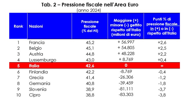 Tuttavia, ci sono anche a livello nazionale delle buone notizie. Il nostro Paese non è più considerato il grande “malato d’Europa” e gli italiani non sono più i maggiori tartassati tra i cittadini dell’Area Euro. Attualmente, tale primato negativo spetta alla Francia, che sta attraversando una crisi politica, sociale ed economica molto preoccupante. In termini di crescita del Pil pro capite, consumi e investimenti, l’Italia ha ampiamente superato la Francia nel corso di quest’anno; quest’ultima ci precede esclusivamente per quanto concerne il carico fiscale. Tale risultato, però, non può certo essere un motivo di vanto. Anzi. Con un prelievo fiscale pari al 45,2% del Pil, è come se lo scorso anno i contribuenti francesi avessero versato complessivamente 57 miliardi di euro di tasse/contributi in più rispetto a noi italiani . Un importo da far tremare i polsi. Tra tutti i paesi dell’Area Euro nessun altro conta una pressione fiscale superiore a quella francese (vedi Tab. 2).