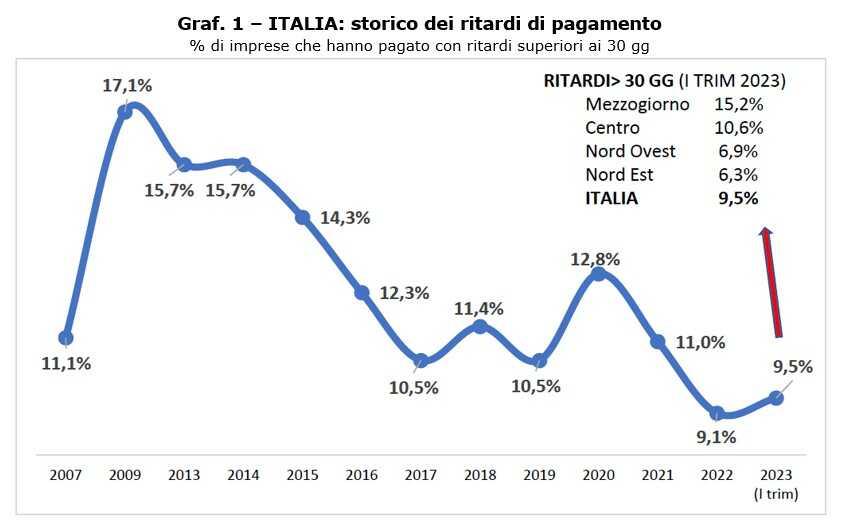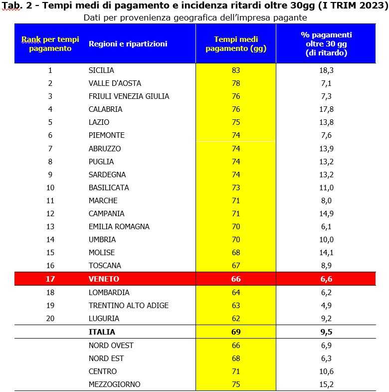 Se nel primo trimestre di quest’anno a livello nazionale il tempo medio di pagamento è stato di 69 giorni, le imprese committenti della Sicilia hanno saldato i propri fornitori dopo 83 giorni. Nella classifica dei “cattivi” pagatori seguono le aziende della Valle d’Aosta con 78 giorni e quelle del Friuli Venezia e della Calabria con 76. Le aziende pagatrici più virtuose, invece, risiedono in Veneto (con un tempo medio di pagamento pari a 66), in Lombardia (64), in Trentino Alto Adige (63) e, in particolar modo, in Liguria (62). Sempre nel primo trimestre del 2023, la percentuale in cui i pagamenti sono avvenuti dopo i 30 giorni interessa soprattutto il Sud.