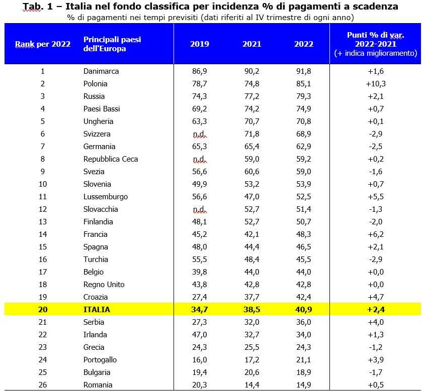 In Italia, secondo i dati raccolti da Cribis Itrade , nel quarto trimestre 2022 la percentuale di pagamenti avvenuta entro i tempi previsti dal contratto commerciale tra committenti e fornitori si è attestata al 40,9%. In altre parole, ciò vuol dire che solo in 4 transazioni su 10 la scadenza di pagamento è stata rispettata. Tra i 26 Paesi dell’area europea monitorati, nella classifica dei più virtuosi l’Italia si è “piazzata” al 20° posto.