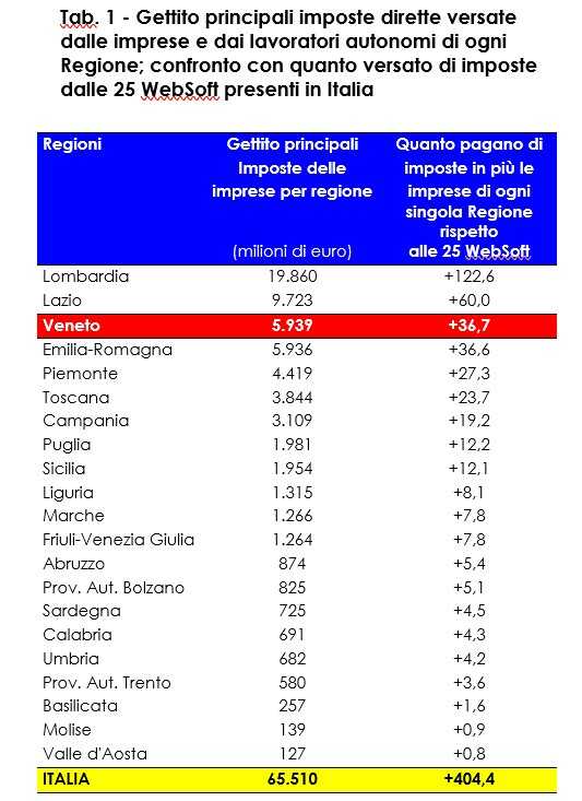 Ancorchè il risultato della comparazione risenta di alcune fragilità presenti nella metodologia di calcolo adottata, tutte le imprese venete nel 2020 (ultimo anno in cui il dato è disponibile) hanno versato all’erario 5,9 miliardi di imposte sul reddito, mentre le 25 principali multinazionali del web presenti nel Paese, benché abbiano realizzato oltre 9 miliardi di fatturato, nel 2022 hanno versato al fisco solo 162 milioni di euro. Teniamo a sottolineare che si tratta di un banalissimo caso di scuola che ha l’obbiettivo di dimostrare, in linea puramente teorica, che le nostre imprese, prevalentemente micro, pagano complessivamente molto di più delle grandi Web companies: per la precisione 36,7 volte. Non solo. In Italia solo le aziende lombarde e laziali hanno registrato uno sforzo fiscale rispetto ai giganti digitali superiore al nostro (vedi Tab. 1). A dirlo è l’Ufficio studi della CGIA.