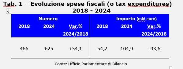 L’Ufficio Parlamentare di Bilancio rileva che nel 2024 si contano ben 625 sconti fiscali (deduzioni, detrazioni, crediti di imposta, etc.), mentre nel 2018 erano 466 (variazione +34,1%). L’incremento è riconducibile all’impennata subita dai crediti di imposta legati ai lavori edilizi. Queste 625 voci di spesa garantiscono uno sconto fiscale a tutti i contribuenti italiani (lavoratori dipendenti, pensionati, lavoratori autonomi e imprese) che, quest’anno, sfiora i 105 miliardi di euro. Rispetto al 2018 (quando cubavano 54,2 miliardi), le agevolazioni economiche in valore assoluto sono quasi raddoppiate (+93,6%) (vedi Tab. 1).