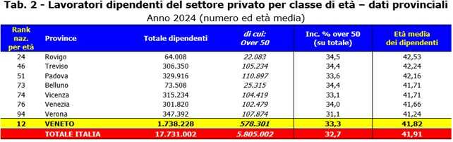 A livello regionale la Basilicata registra l’età media più elevata tra i dipendenti privati (42,93 anni), seguita da Molise (42,65) e Umbria (42,55). Il Veneto è a metà classifica con un’età media di 41,82. Il Friuli Venezia Giulia, invece, detiene il primato per l’incidenza degli over 50 sul totale degli occupati, pari al 35,7%. Nella nostra regione, invece, la quota è al 33,3%.