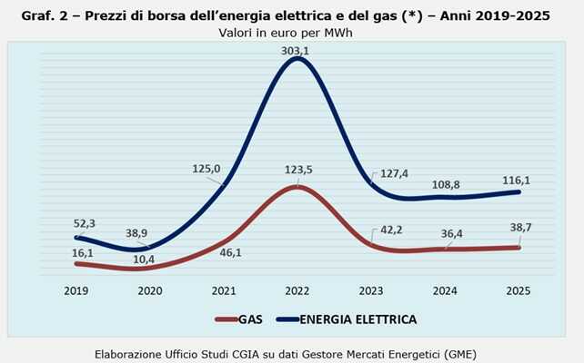 Oggi, pur in presenza di un rialzo significativo, siamo lontani da quei picchi: la media del 2025 si attesta a 116,1 euro per l’energia elettrica e a 38,7 per il gas. Numeri che invitano alla prudenza, ma che ridimensionano il paragone con la crisi energetica innescata dalla guerra in Ucraina (vedi Graf. 2).