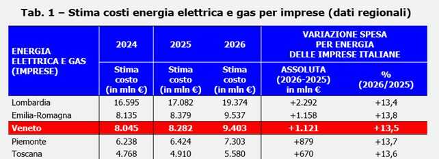 Le realtà imprenditoriali più penalizzate dall’incremento delle bollette sarebbero quelle ubicate nelle regioni dove la presenza delle attività commerciali e produttive è più diffusa. Come la Lombardia che dovrebbe registrare un aumento dei costi energetici di quasi 2,3 miliardi di euro. Seguono l’Emilia Romagna con +1,2 miliardi, il nostro Veneto con 1,1 miliardi, il Piemonte con 879 milioni e la Toscana con 670 milioni (vedi Tab. 1).