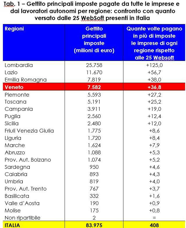 • Solo in Molise e Valle d’Aosta le big tech pagano più delle imprese locali