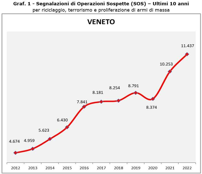 Negli ultimi 10 anni, le segnalazioni alla UIF arrivate dal Veneto sono aumentate del 144%. Se nel 2012 erano 4.674, nel 2022, come abbiamo riportato più sopra, hanno raggiunto la quota record di 11.437 (vedi Graf. 1).