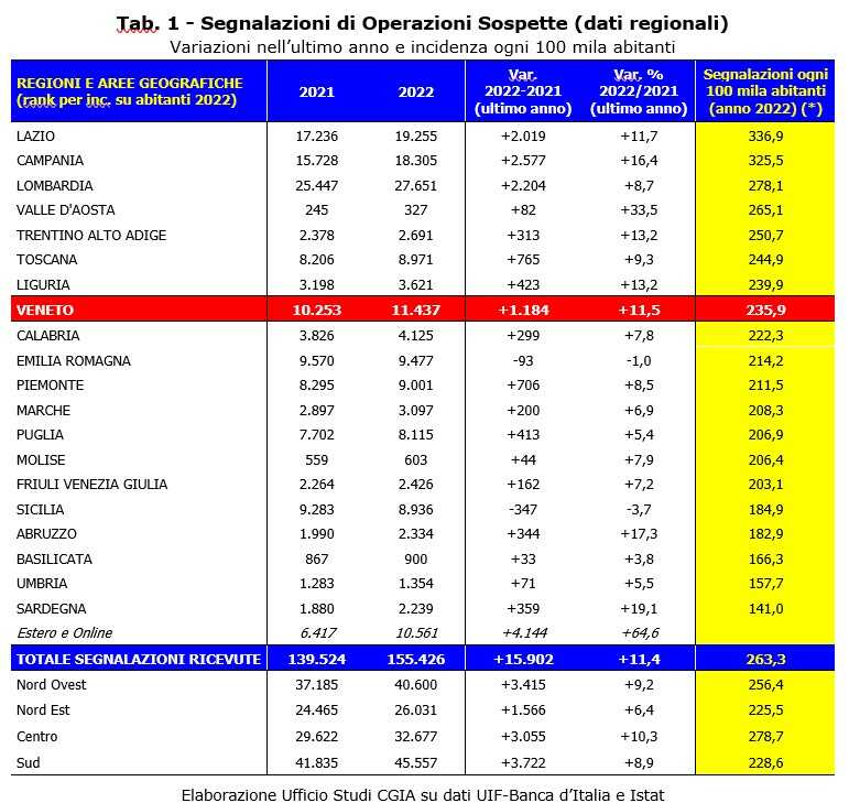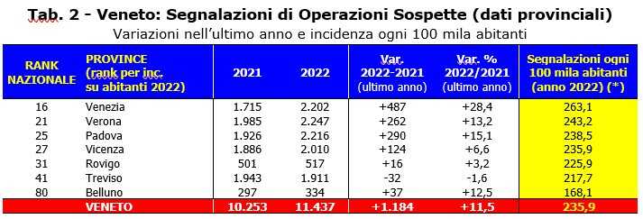 Nel 2022 il numero di operazioni sospette pervenute all’Unità di Informazione Finanziaria dal Veneto (UIF) ha toccato le 11.437 segnalazioni (235,9 ogni 100mila abitanti).