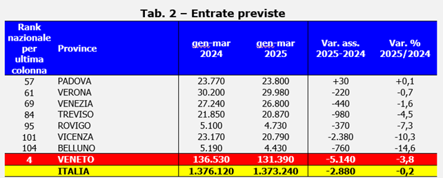 Nel primo trimestre di quest’anno le imprese venete hanno l’intenzione di assumere oltre 131.000 lavoratori; un importo, quest’ultimo, in calo di 5.140 unità rispetto a quanto denunciato nello stesso periodo del 2024. Dopo il Piemonte (-7,2%), la Lombardia (-6,5) e il Friuli Venezia Giulia (-4,2), siamo la regione con la contrazione più significativa. A livello provinciale è Verona con 29.980 assunzioni previste (-0,7% rispetto 2024) a guidare la graduatoria regionale. Seguono Venezia con 26.800 (-1,6%) e Padova con 23.800 (+0,1%) (vedi Tab. 2).