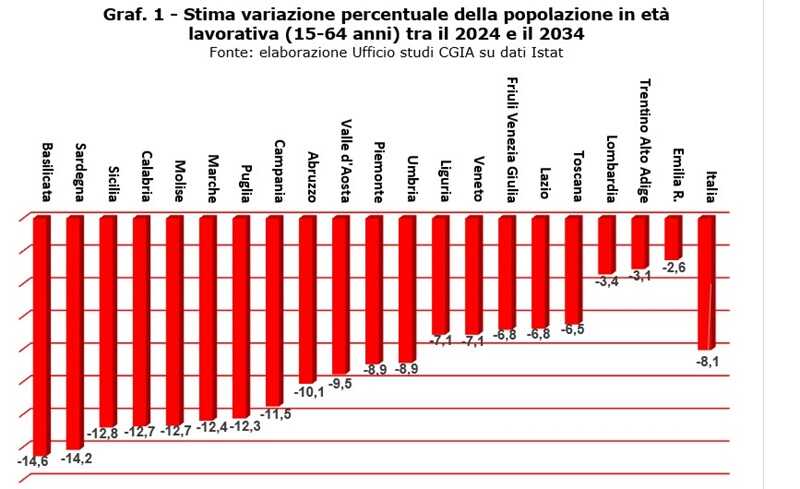 Le contrazioni della popolazione in età lavorativa più importanti riguarderanno, in particolare, il Sud. Lo scenario più critico interesserà la Basilicata che entro il prossimo decennio subirà una riduzione di questa platea di persone del 14,56% (-49.466 persone). Seguono la Sardegna con il -14,2% (-110.999), la Sicilia con il -12,8% (-392.873), la Calabria con il -12,7% (-147.979) e Molise con il -12,7% (-22.980). Per contro, le regioni meno interessate da questo fenomeno saranno la Lombardia con il -3,4% (-218.678), il Trentino Alto Adige con il -3,1% (-21.368) e, infine, l’Emilia Romagna con il -2,6% (-71.665) (vedi Tab. 1 e Graf. 1).