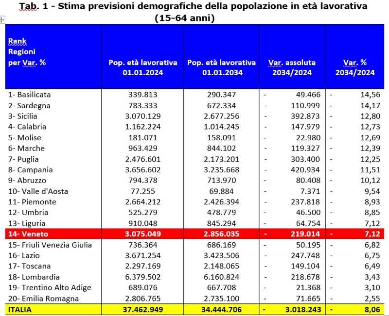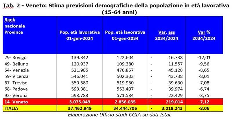 A livello veneto, la provincia più interessata dalla contrazione demografica della fascia lavorativa tra i 15 e 64 anni sarà Rovigo.