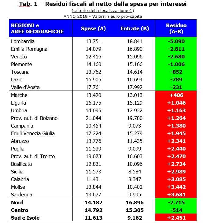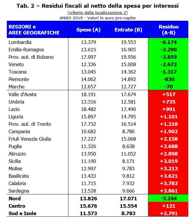 Tornando ai dati sul “residuo fiscale”, le regioni del Sud presentano, invece, un risultato positivo; essendo maggiormente in difficoltà economica rispetto al resto del Paese, i flussi finanziari che ricevono sono superiori alle risorse economiche che “versano” allo Stato centrale. La Campania, ad esempio, sempre nel 2019 ha registrato un “saldo” pro capite pari a +1.380 euro, la Puglia +2.440 euro, la Sicilia +2.989 euro e la Calabria +3.085 euro.
