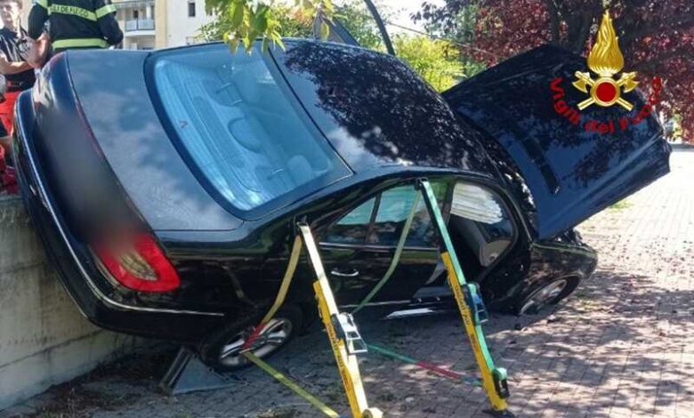 In mattinata, i Vigili del fuoco del comando di Pordenone sono intervenuti, con una squadra e l’autogru della sede centrale, a Cordenons dove, probabilmente per un errore di manovra, una Mercedes è caduta per circa 1 metro e mezzo, dal parcheggio rialzato dell’Eurospar, finendo con la parte anteriore appoggiata ad un albero e rimanendo in bilico tra il muretto del parcheggio e il marciapiede sottostante.