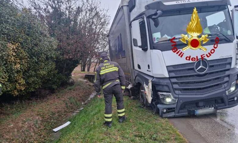 L’intervento dei Vigili del fuoco del locale distaccamento ha richiesto l’intervento dell’autogru da Treviso per rimettere il mezzo pesante sulla carreggiata.