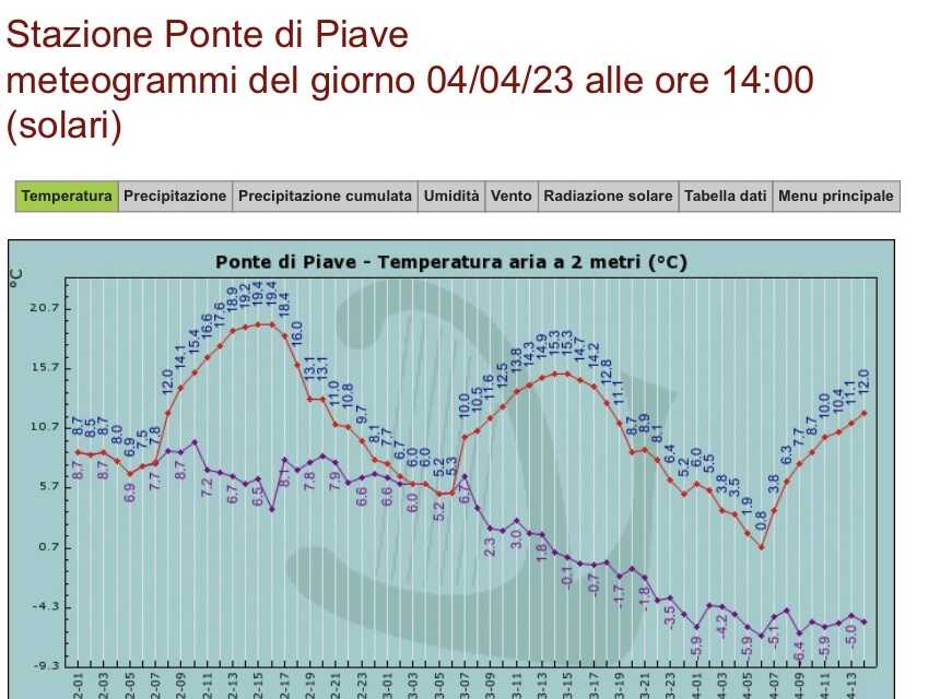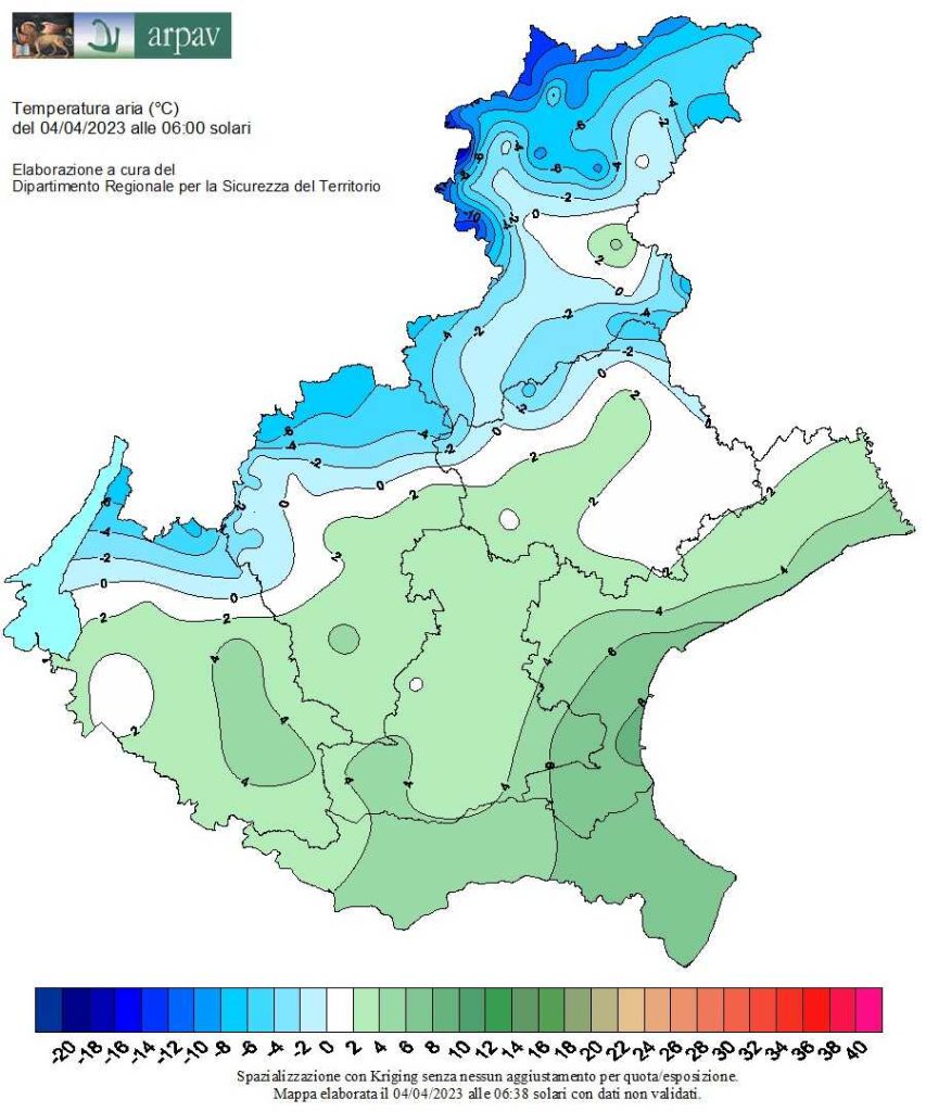 e in pianura lungo la fascia pedemontana e sulla Sinistra Piave dove la centralina di Gaiarine è andata di poco sotto lo zero (-0,1°) e Ponte di Piave poco sopra (+0,8°).